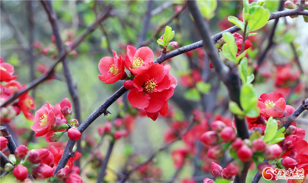 贴梗海棠热烈绽放,艳红的花朵缀满枝头,与嫩绿新叶相映成趣,引得游人驻足观赏、拍照打卡。