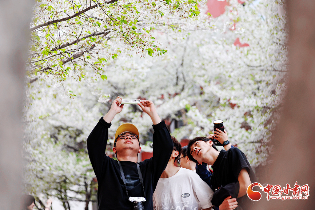 4月5日,学生们在兰州大学校园内拍摄樱花。