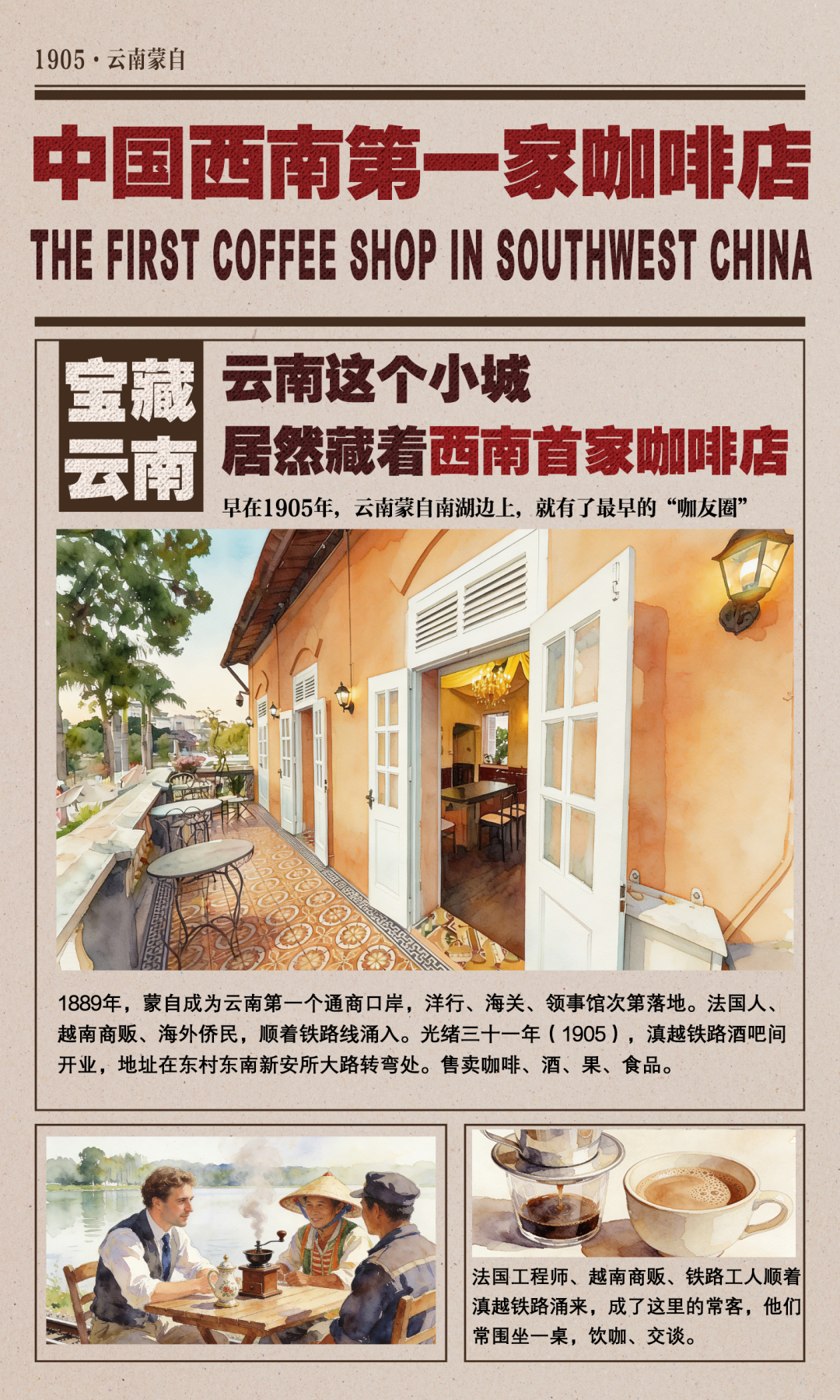 虽是“苦中药”,却也是彼时作为云南第一个通商口岸的蒙自无数人的“心头好”。法国工程师、越南商贩、铁路工人顺着滇越铁路涌来,成了这里的常客。他们围坐一桌,木质桌椅、法式摆件,研磨机一转,香气一散——南湖边上,有了最早的“咖友圈”。