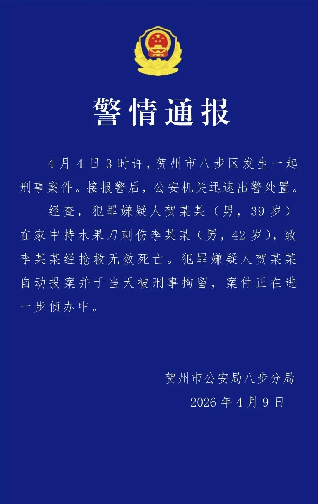 央视网消息:广西贺州市公安局八步分局4月9日通报:4月4日3时许,贺州市八步区发生一起刑事案件。接报警后,公安机关迅速出警处置。