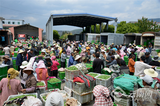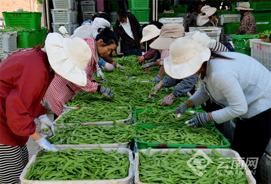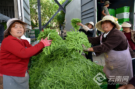连日来,随着荷兰豆市场行情走俏,昆明市晋宁区六街镇大庄村荷兰豆交易市场迎来交易旺季,刚从田间采摘的翠绿荷兰豆堆满箩筐,现场收购交易和分拣装运作业异常红火。