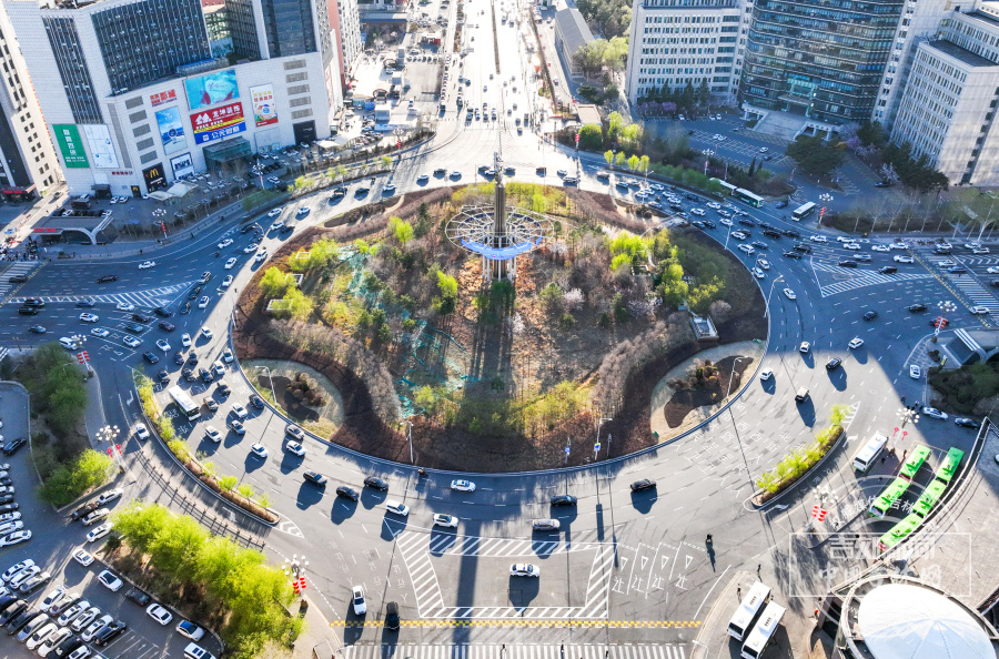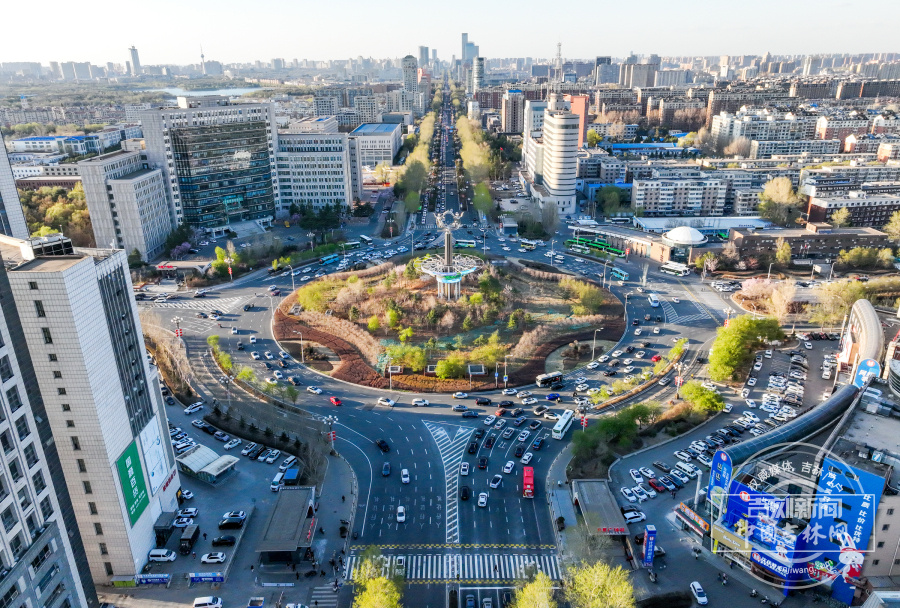 4月22日晚高峰时段,航拍采用“螺纹式”交通标线的长春卫星广场,车辆沿标线有序通行,整体车流衔接顺畅。
