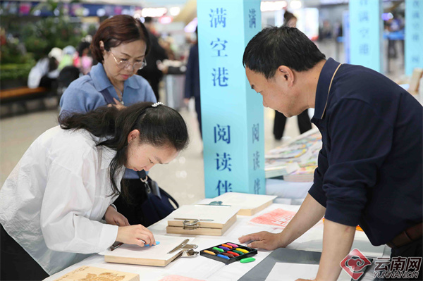 “人间草木·边疆来信”文字特展在机场城市会客厅亮相,以汪曾祺经典作品摘录与边境群众真实心声为主线,搭配“书信漂流”“声音邮局”等互动体验,让旅客走近边疆故事。集团原创IP“云朵小象”通过巡游、打卡、文创展示等方式增添阅读乐趣。非遗拓印体验区则让旅客亲手制作融合民航与云南文化元素的拓印作品,感受传统文化魅力。