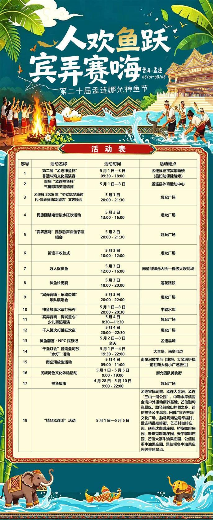 5月1日至5日,将迎来第二十届孟连娜允神鱼节。此次神鱼节共有18项主题活动,除了经典的万人捉鱼外,还新增了电音泼水狂欢、神鱼潮范NPC民族记、乐队Live等丰富多彩的活动。