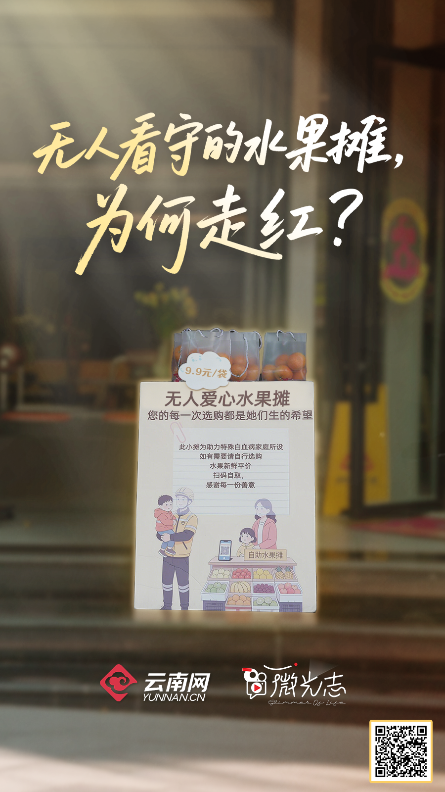 就这样,一个无人售卖爱心水果摊开始营业了。摊点前摆放着一块牌子,上面写着:“此小摊为助力特殊白血病家庭所设,如有需要请自行选购。”