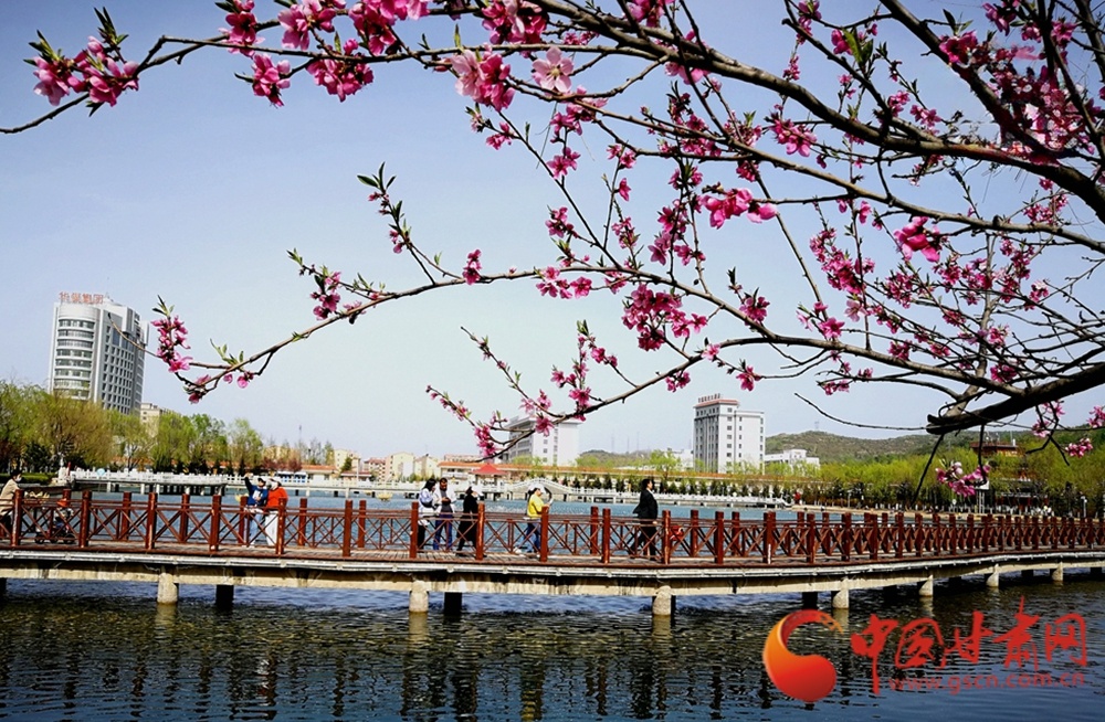 莲湖岸畔,粉艳桃花垂枝映水,栈桥上行人悠然漫步,楼宇静立,一派生机盎然