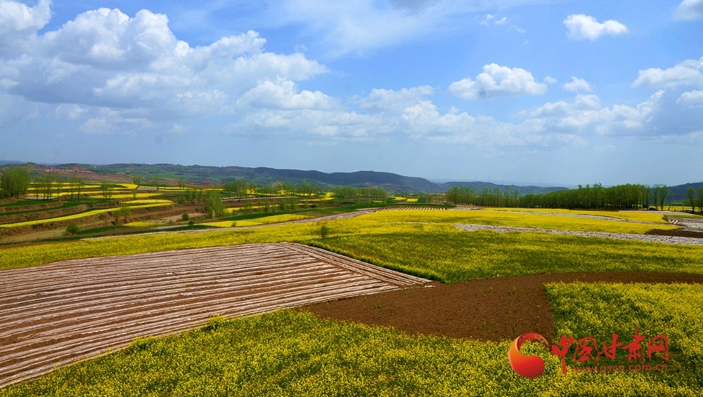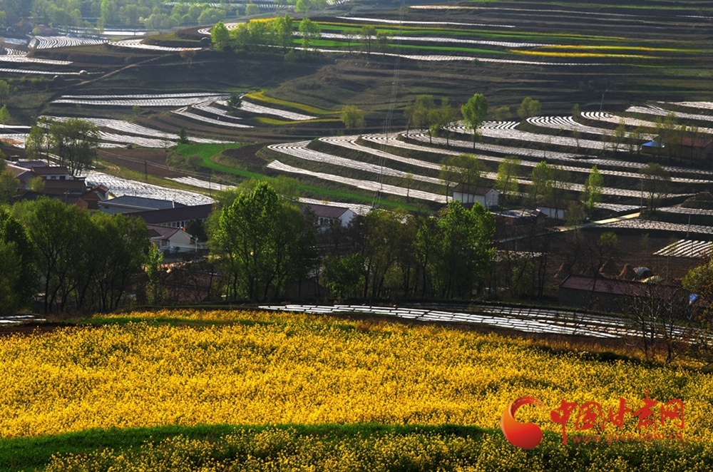 金黄的油菜花田与层层梯田相映成趣,错落的村落掩映在绿树间,这是黄土坡上的春日盛景