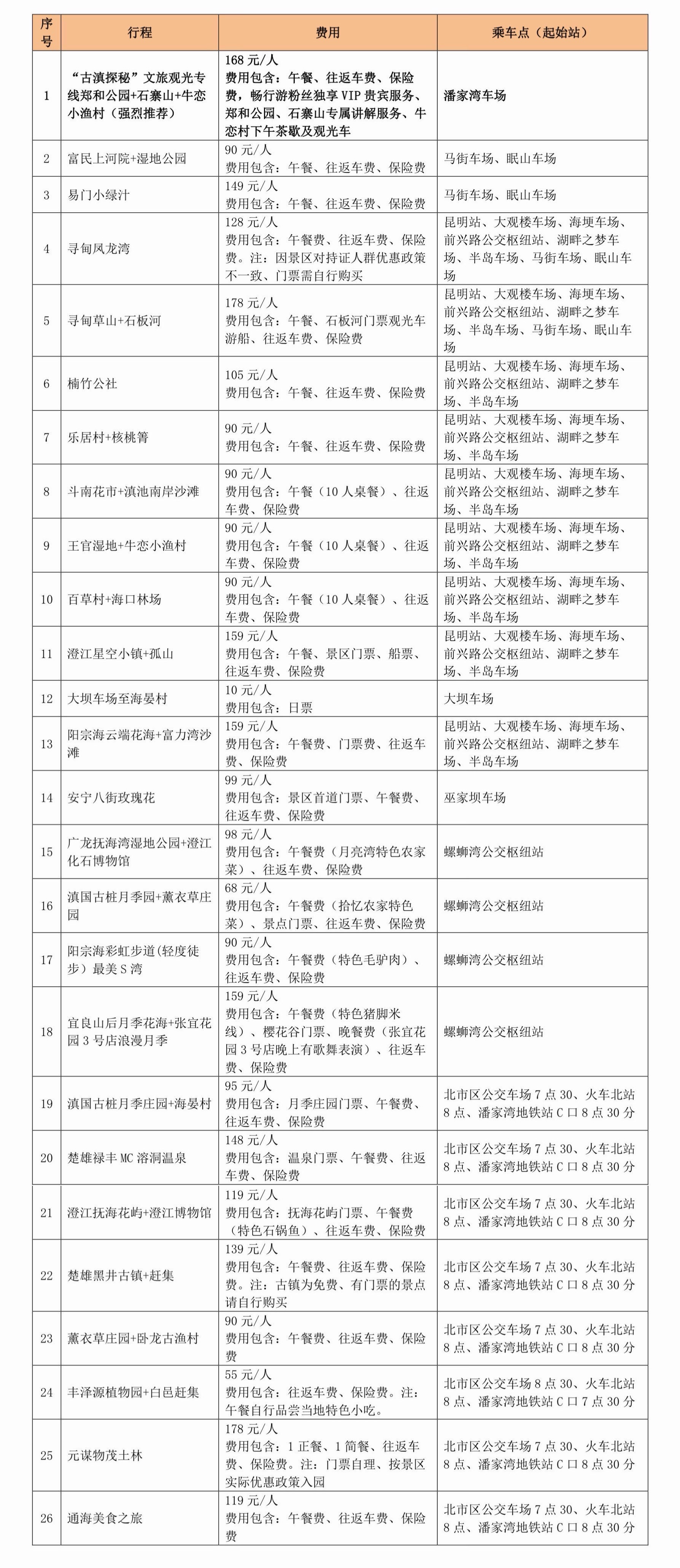 据了解,26条昆明周边一日游线路紧密贴合“轻度假”趋势,将通勤频率较高的公交场站转化为城市周边游的集散中心,串联起古滇文化、滇池沿岸生态、特色村落、极致花海等多个主题场景,价格从10元到178元不等。