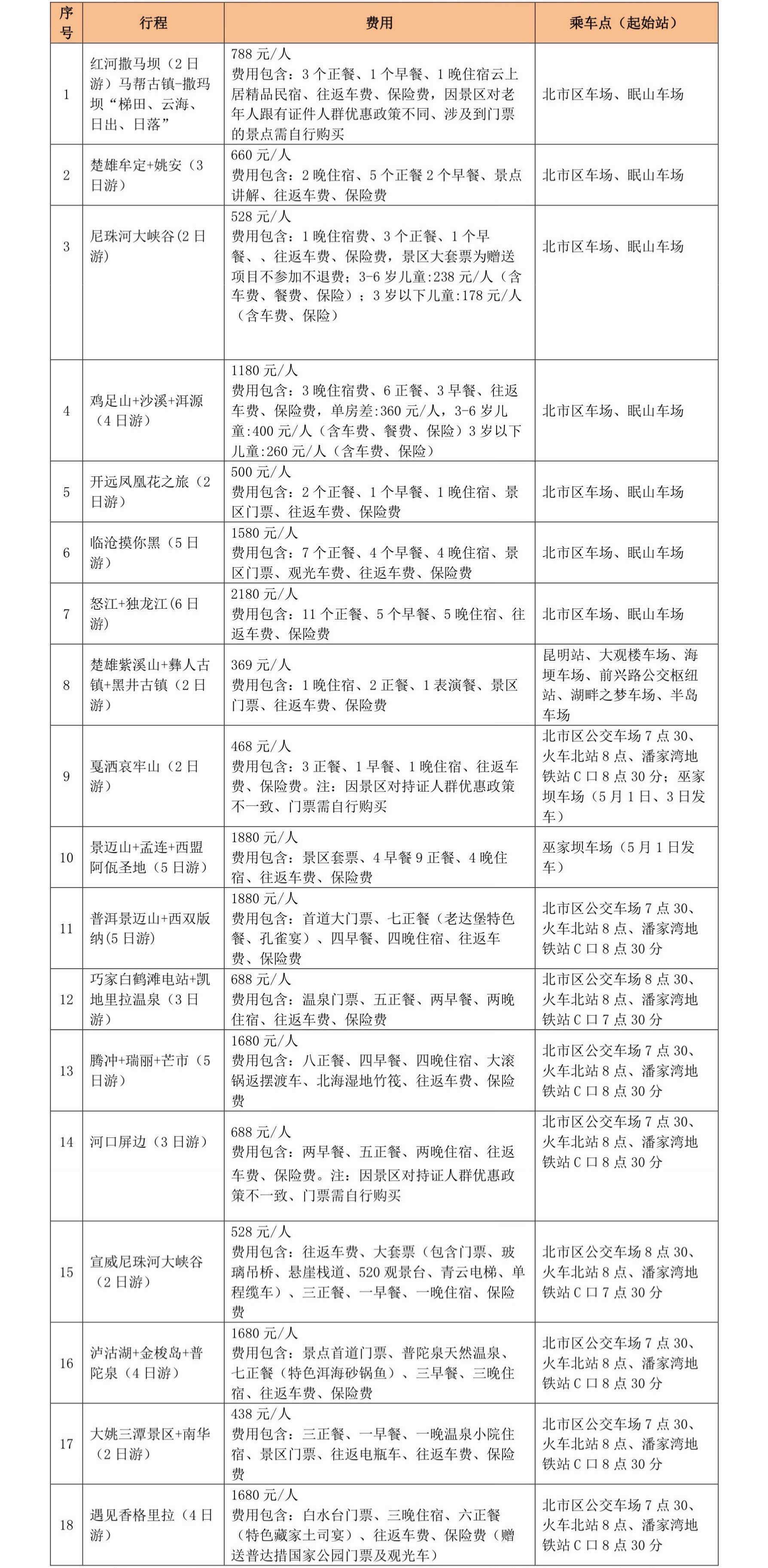 18条线路行程深入红河、楚雄、大理、临沧、怒江、普洱、腾冲、香格里拉等地,时长从2天到6天不等,兼顾梯田云海、峡谷温泉、民族节庆、古镇漫游等多种体验形态。