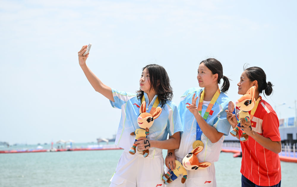 4月25日,冠军中国选手李馨璇(中)、亚军中国选手陈奕静(左)和季军越南选手武美田在颁奖仪式上自拍。新华社记者 贝赫 摄