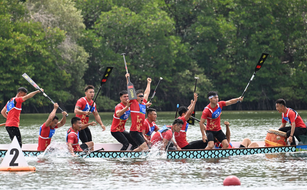 4月26日,中国队在男子组12人龙舟400米直道赛决赛夺冠后庆祝。新华社记者 魏海 摄