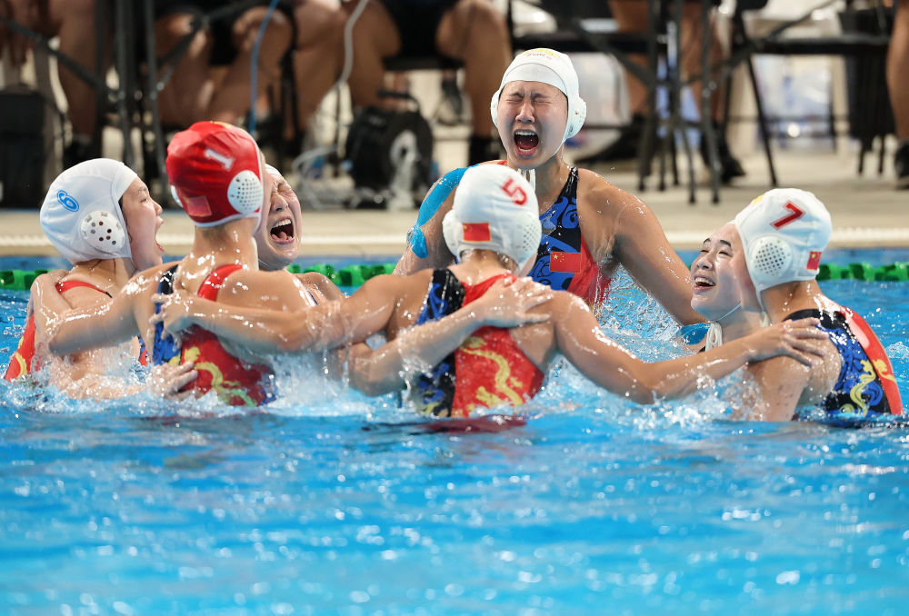 4月24日,中国队球员在女子水球单循环决赛后庆祝。新华社记者 朱唯希 摄