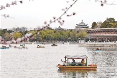 近日,颐和园、北海公园、陶然亭公园、玉渊潭公园、紫竹院公园等五家北京市属公园游船同步开航。图为市民游客乘坐游船在北海公园的湖面上游玩,感受春日美景。摄影/本报记者袁艺