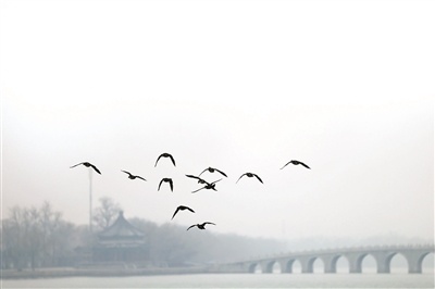3月初,大批越冬候鸟流连于颐和园昆明湖。摄影/本报记者杨益绿头鸭从玉渊潭公园上空飞过。从颐和园昆明湖到什刹海波心,从奥林匹克森林公园南园湿地到北海太液池,成群的候鸟如期而至,或游弋清波,或振翅长空,为古都早春绘就灵动生态画卷