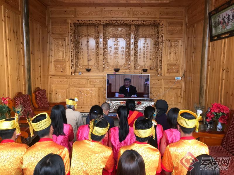怒江傈僳族自治州兰坪白族普米族自治县通甸镇易门箐普米族群众观看改革开放40周年庆祝大会