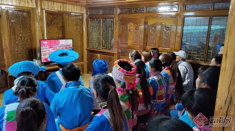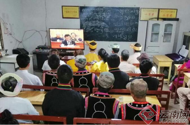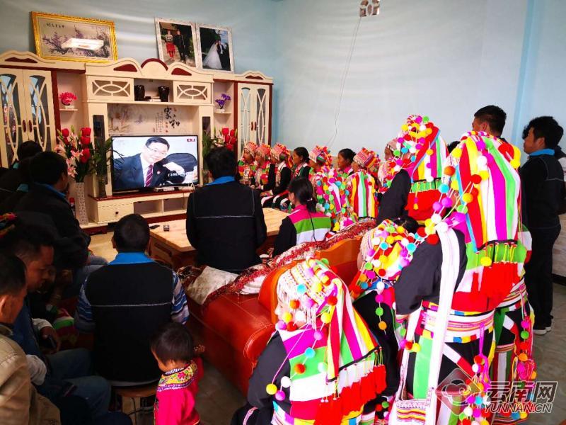 大理白族自治州南涧县无量山镇德安村彝族群众正在收看改革开放40周年大会实况。通讯员 适志宏 曹利民