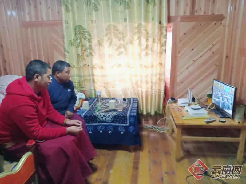 迪庆藏族自治州德钦县红坡寺僧人在僧舍中观看庆祝大会