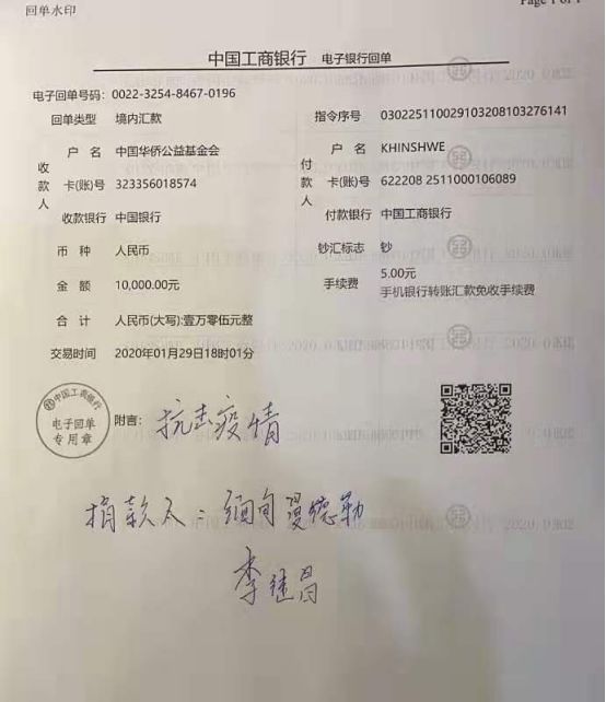 缅甸中华总商会副会长、云南省侨联顾问林文猛先生捐赠人民币10万元,他说:爱国爱乡是我们缅甸华人华侨的优良传统,祖籍国武汉的疫情现在比较严峻,全体华人一直高度关注着,并为此感到忧心和焦虑。我期盼疫情早日得到控制,同胞尽快恢复正常生活。我们相信,在祖籍国政府的坚强领导下,全体同胞齐心协力,我们一定能够打赢这场疫情防控阻击战!武汉加油!中国加油!!
