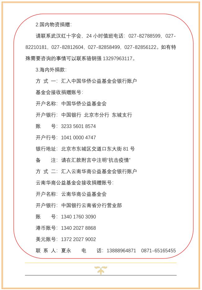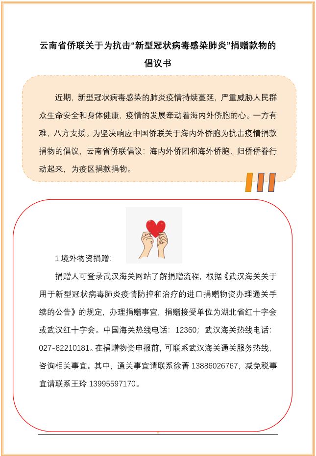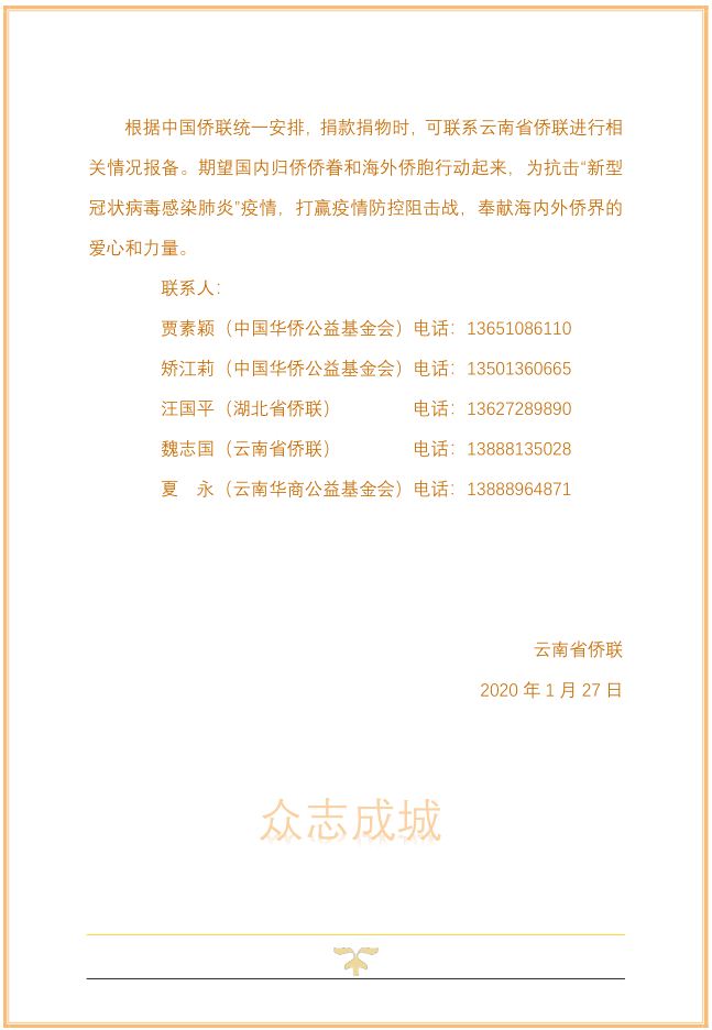 云南网讯 连日来,国内新型冠状病毒感染的肺炎疫情牵动着海内外华侨华人的心。云南省侨联响应中国侨联号召,于1月27日向海内外侨界发出倡议。倡议发出后,得到国内海外的云南乡亲积极响应迅速行动捐款捐物,彰显侨界“爱国爱乡”大爱情怀。