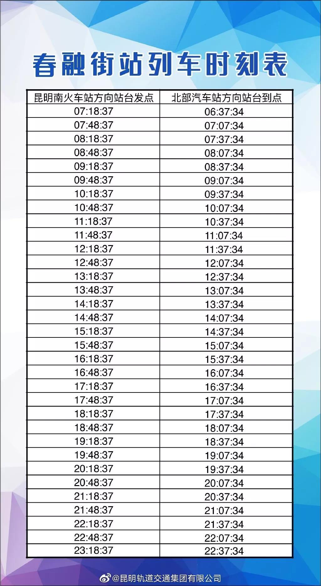 2020年1月30日起,昆明地铁部分线路及车站暂时关闭,1、2号线首期工程及支线沿途仅停靠昆明南火车站、春融街站、南部汽车站、珥季路、环城南路站、北辰站、北部汽车站7个站点。为方便广大乘客出行,昆明轨道交通集团有限公司为大家制作了每个站点列车进站时刻表,有需要的乘客记得保存哦~