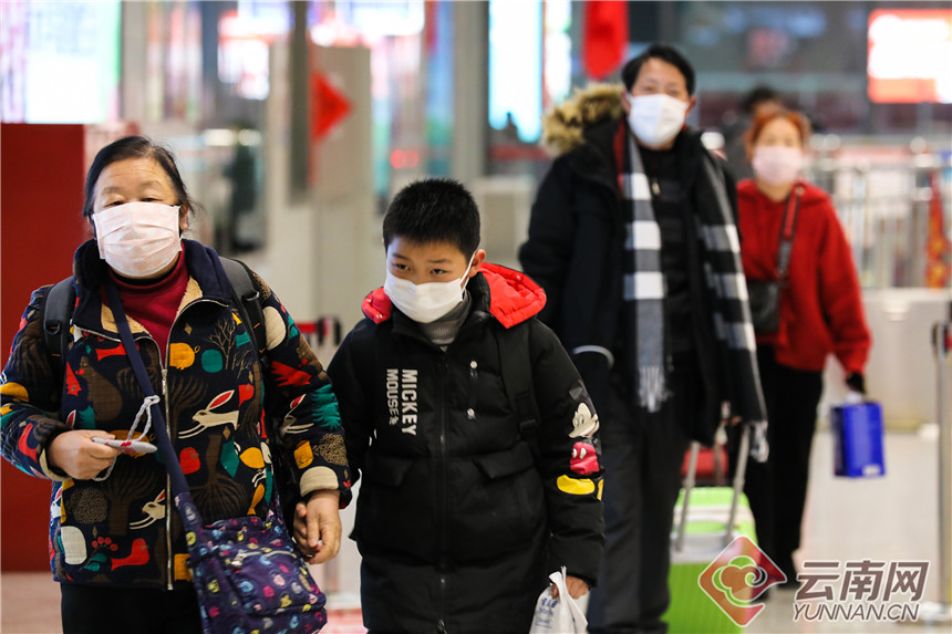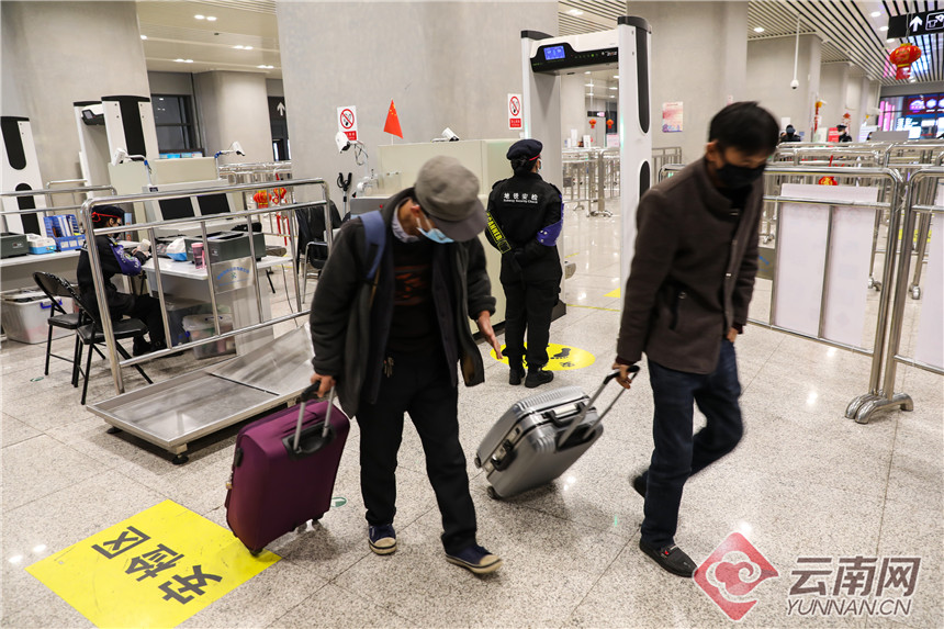 2月3日,在昆明南火车站地铁站,乘客提着大包小包经过安检,刷卡进站,在过安检前,工作人员会对每位乘客进行体温检测,确认无发热症状才允许进站,乘客们“全副武装”,不管是老人还是小孩,每个人都戴着口罩出行,有的乘客还带了护目镜,可谓是“装备齐全”。