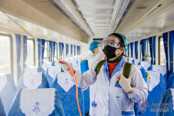 2月4日5时50分,在位于云南昆明火车站旁的客车整备场,朱莲背起装入重20公斤消毒液的电动喷雾桶,踏上从丽江刚到昆明的一趟旅客列车。