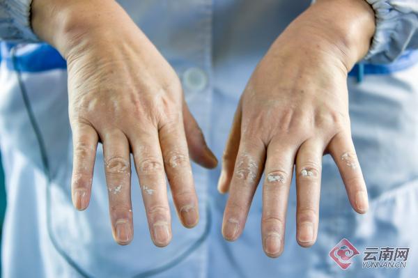 “苦点累点没啥,就是长时间戴手套,被汗和消毒液浸泡,手指痒得受不了。”说话间,朱莲脱下手套,调整喷雾桶背带长度,双手十指已经肿了起来。