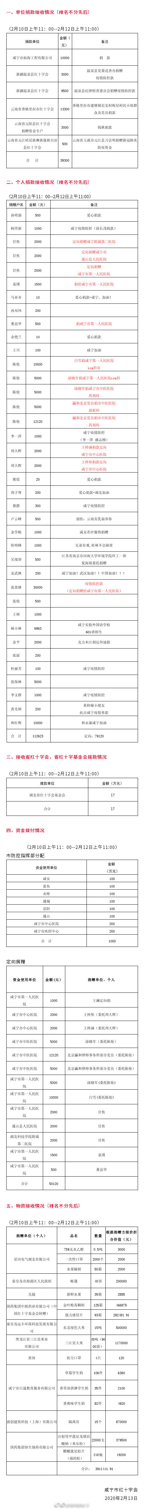 市红十字会接收捐赠款物由咸宁市新型冠状病毒感染的肺炎防控指挥部统一调配使用。咸宁市红十字会将依法依规公布捐赠接收和使用情况,接受社会监督。现将捐赠情况公示如下: