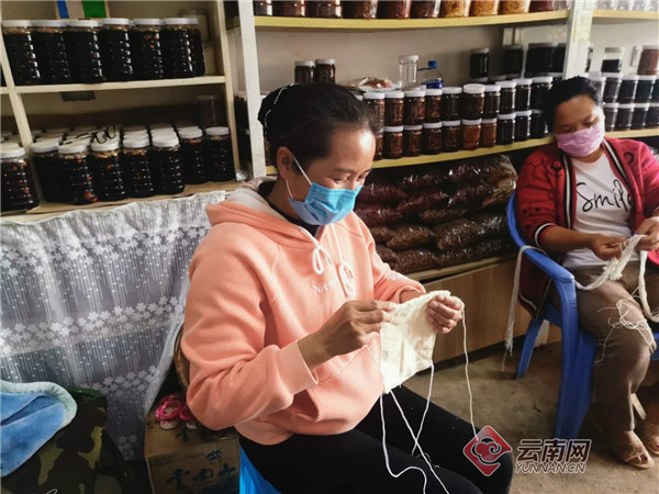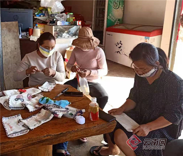 在澜沧县糯扎渡镇栘依协会,往日琳琅满目的栘依果停止了销售,协会的妇女们都纷纷缝起了口罩。大家各有分工、有条不紊,裁布、穿针、缝制……不一会功夫,几个像模像样的自制口罩便缝制成功。