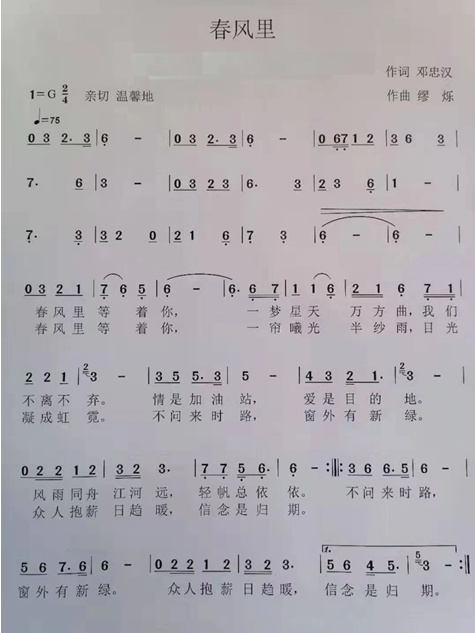 出自滇西保山地区的歌曲《望春风》,由作家邓忠汉作词、作曲家缪烁作曲、青年歌手王晓丹和余宝龙演唱,温润真挚地表达了对全民决战决胜“抗疫”阻击战的美好期盼和必胜信念。