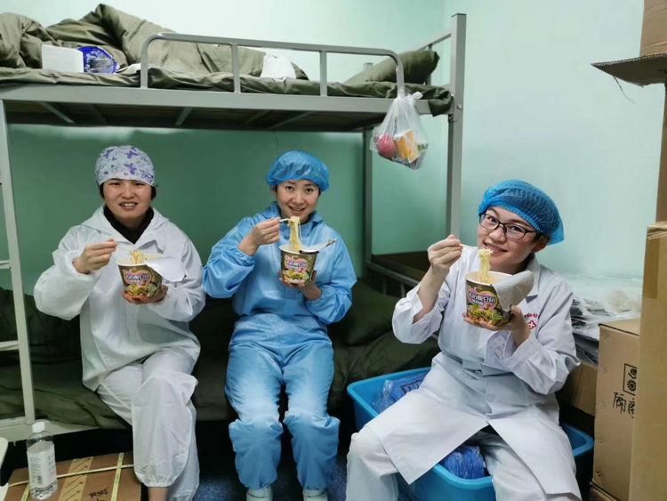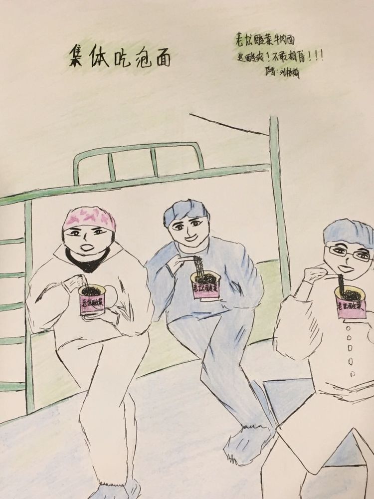 因为已经过了饭点,大家集体在值班室里吃起了泡面,还满足的说着:“泡面太好吃了,我们把汤都喝光了”!
