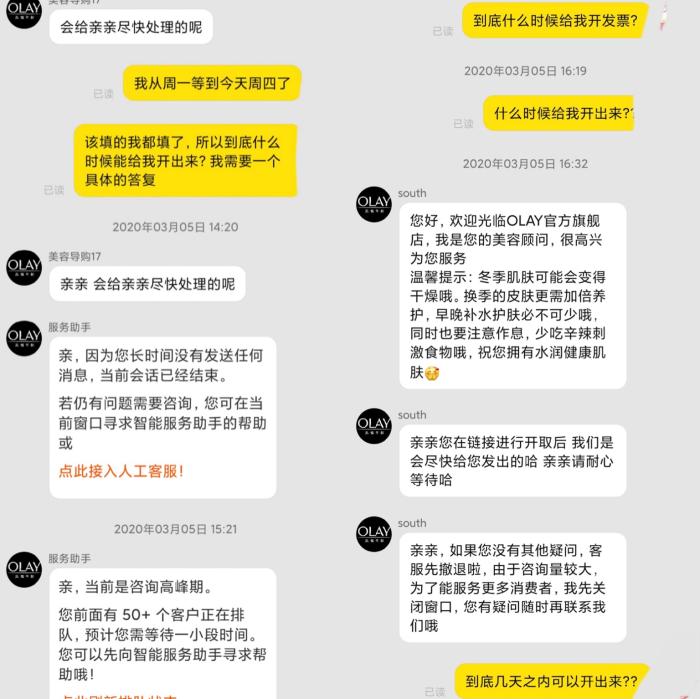 消费者小刘也表示:“我3月1日向Olay官方旗舰店索要2017年至2018年三笔订单的发票,客服回复很慢,也没回复什么有价值的信息。不说可不可以开,也不说什么时候能开,只是让我等待。”