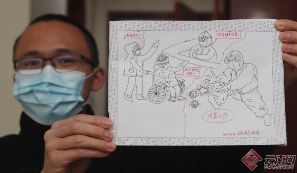 记者印象最深刻的是2月22日的一幅画,画中是来自云南省第一人民医院的男护士在一线抗击疫情。