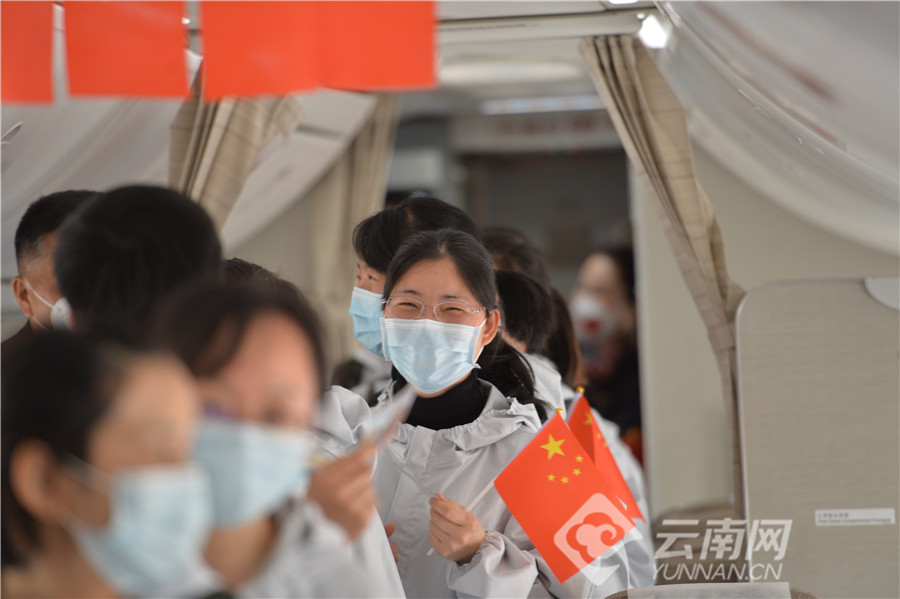 【高清组图】机舱内红旗飘飘 云南援湖北医疗队员回家了