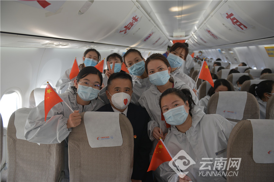 【高清组图】机舱内红旗飘飘 云南援湖北医疗队员回家了