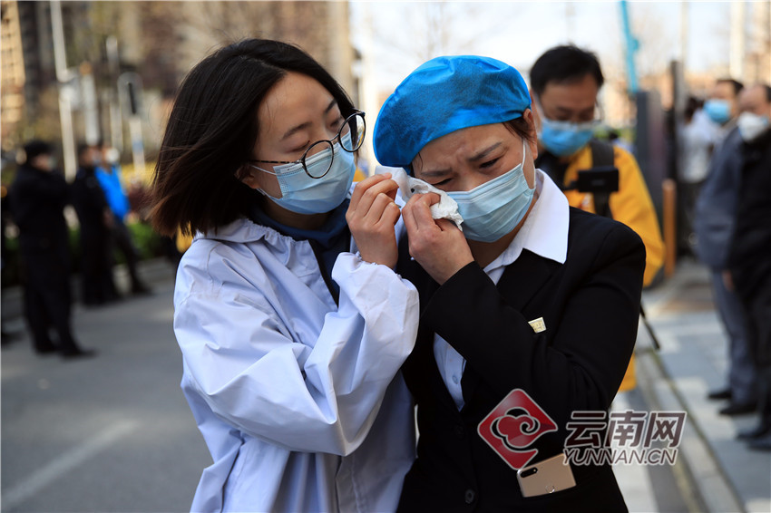 武汉市汉阳区政府副区长彭焚一行来到驻点为医疗队送行。他说,车队前面不仅安排有警车开道,后面也有警车护送,“非常感谢云南的医护人员冒着生命危险驰援武汉,在这里夜以继日拯救生命。”