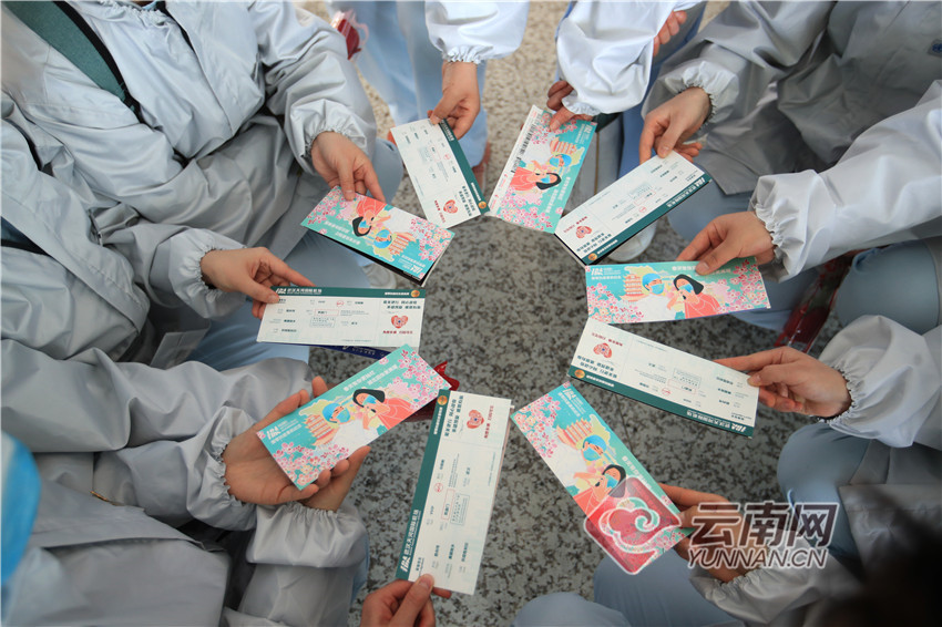 3月18日,云南首批支援武汉医疗队返程,医疗队员们展示天和机场为他们准备的限量版纪念机票。记者 陈飞 摄