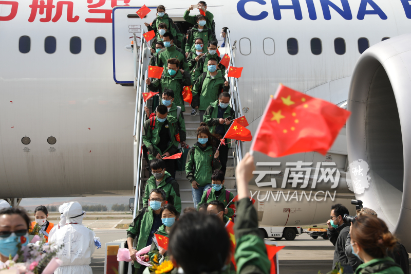 3月22日下午,来自云南省7个州市、各省直部门、随团媒体记者在内的754名援助湖北医疗队队员分乘4架航班从湖北返昆。其中,含云南日报报业集团和云南广播电视台记者8名、支援武汉医护人员263人,支援咸宁医护人员483人。