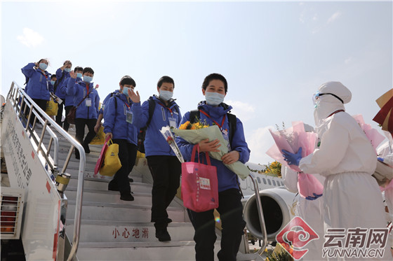 “终于回来了,回家的感觉真好。”“云南的空气真美,我闻到了故乡的味道。”医护人员边走边抬起手臂向欢迎的人群致意。在舷梯脚,工作人员把一捧捧鲜花递到了医护人员手中。