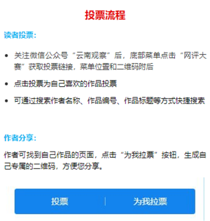 先关注微信公众号“云南观察”(ID:yunnanyuqing),底部菜单点击“大赛投票”获取投票链接。进入投票页面后,点击作品图片可查看参赛作品详细内容,为喜欢的作品投票;也可通过搜索作者名称或作品标题或作品序号,快速查找进行投票。网友也可通过作品文末 “为我拉票”按钮,分享二维码,邀请朋友参与投票。