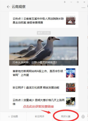 目前,大赛组委会从来自云南及江苏、陕西、重庆、四川、北京、浙江等10余省份的1000余篇来稿中,遴选并在云南网及各州市报纸、官方网站、自媒体矩阵上正式推送展示了301篇作品。2020年11月5日0时至12日24时,网友们可关注微信公众号“云南观察”参与投票推优活动。301篇作品文章是否出彩、能否进入决赛,等各位网友投上宝贵的一票!
