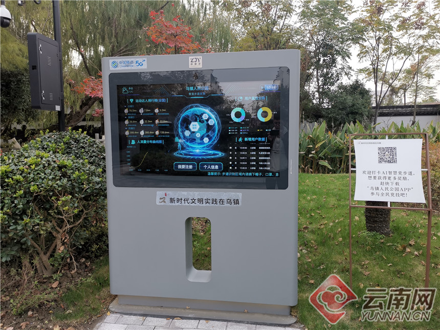 信息收集终端。乌镇人民公园到处可见写有“互联网”“5G”“孵化”等字样的招牌。记者 张成 摄