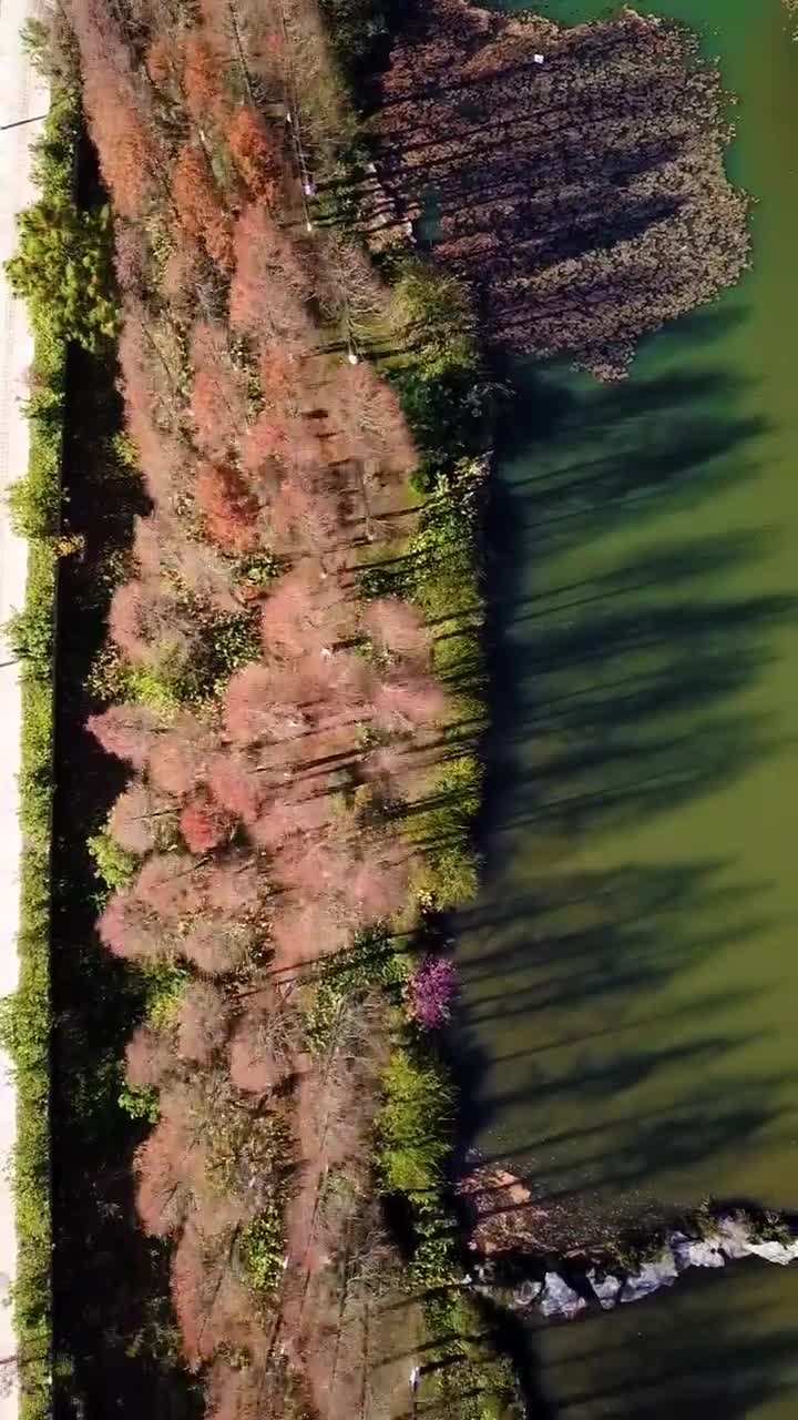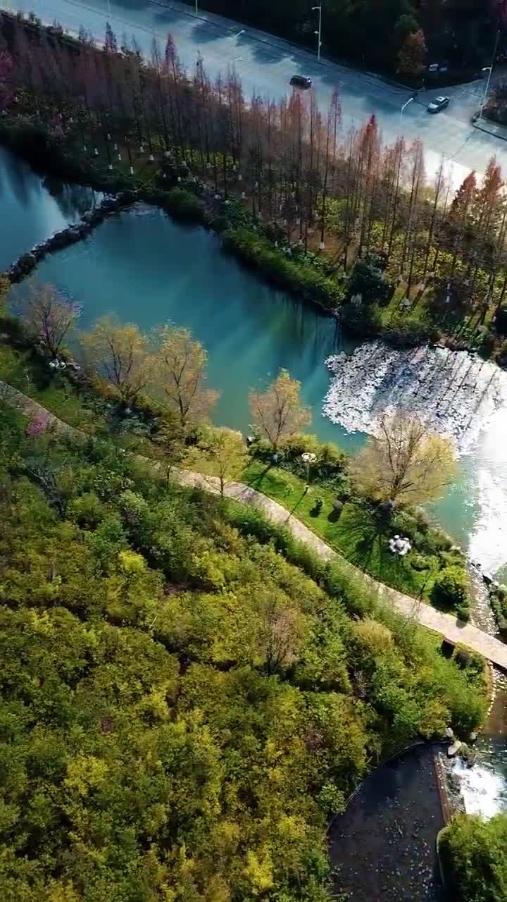 泛红的水杉、粉红的冬樱花,飘零的银杏、舞动的枫叶……一草一木,一花一景,蓝天白云自然成趣,高低错落,在冬日里相互交融,绘出人与自然和谐共生的生态画卷。