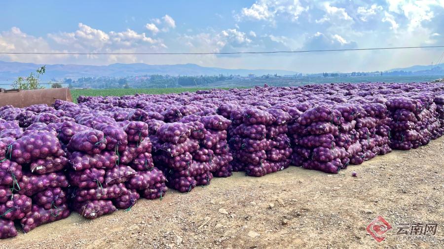 与此同时,同村李美春家的收购点里,已经装袋的洋葱堆成小山,大卡车隆隆作响,准备将洋葱运往江苏、广东等地。李美春做洋葱收购十余年,家里有2个收购点,每年2月到4月中旬,能收100多车(每车33吨)洋葱。“我们面甸的洋葱肉质脆嫩、辣味十足,口感非常好,深受消费者的喜爱。”