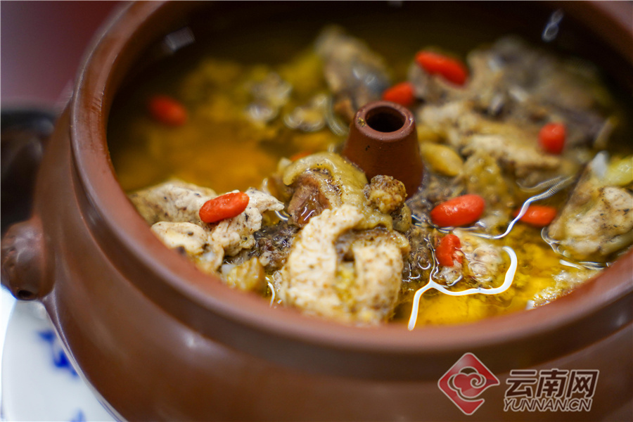 “有了汽锅,还得有好的食材。我们选用当天宰杀的土鸡,经过腌制后加入简单的枸杞、三七、盐放入汽锅。小火慢蒸3小时,蒸汽一层一层往上钻,一滴滴落入汽锅中,肉粑骨离后鲜美汤汁也随之成型。”王策说,汽锅鸡做法虽然简单,但却需要耐心守候、时间沉淀,禧院一直坚持古法足时足料烹制,每天定量接单,确保每道菜真材实料、原汁原味。