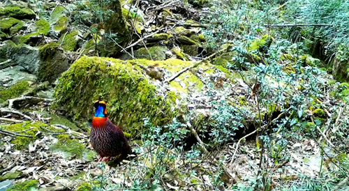 短尾猴隶属灵长目猴科,长相和藏酋猴相似。因其尾巴短而得名。当它们成年后脸颊会变成紫红色或暗红色,也叫红面猴或红脸猴。其体形浑圆、四肢粗壮,体毛稀疏呈黑褐色。短尾猴常成群结队出行,活动范围很大,喜欢选择食源充足、生态环境质量高、枝叶茂密的原始阔叶林、针阔混交林或竹林地带、疏林山坡等区域作为栖息地,主要以野果、种子、竹笋及植物的嫩叶为食物,也捕食蟹、蛙等小动物。短尾猴是国家二级重点保护野生动物,被列入《中国脊椎动物红色名录》(2016年)和《世界自然保护联盟濒危物种红色名录》(IUCN 2013)易危(VU)物种。红腹角雉隶属鸡形目雉科鸟类,体型和大小同家鸡差不多。雄鸟在繁殖期会发出“哇……哇……”酷似小孩啼哭声的鸣叫声,也叫它“娃娃鸡”。尤其是雄鸟羽色十分艳丽,头顶上长着乌黑发亮的羽冠,羽冠的两侧长着一对钴蓝色且精巧而美丽的肉质角,这就是“角雉”名称的由来。雄鸟的肉质角平时藏而不露,当进入繁殖期,这对肉质角就会充气、膨胀,展开呈多色且漂亮的肉裙,其斑纹似“寿”字状。主要以乔木、灌木、竹及草本植物的鲜枝嫩叶、种子为食。红腹角雉是国家二级重点保护野生动物,被列入《世界濒危鸟类名录》和《中国生物多样性红色名录·脊椎动物卷》近危(NT)物种。