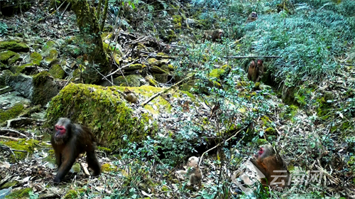“短尾猴和红腹角雉都是生活在偏高海拔山林的动物, 同一台红外相机在同一点位拍到这两种‘国保级’动物生活场景,在龙陵县境内较为罕见,仅能在大雪山片区监测到。经过初步调查,目前这里的短尾猴的数量约在220只。尤其是在仅为5800多公顷的狭小山地区域内就分布有天行长臂猿、菲氏叶猴、北豚尾猴、蜂猴、熊猴、猕猴和短尾猴7种灵长类野生动物,这种情况在中国的自然保护区里是罕见的,可以形象地称之为中国边境线上灵长类动物的‘诺亚方舟’”大理大学东喜玛拉雅研究院实习研究员房以好说。