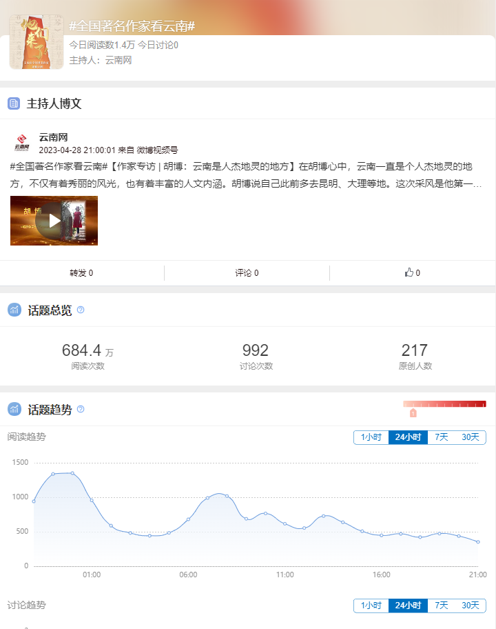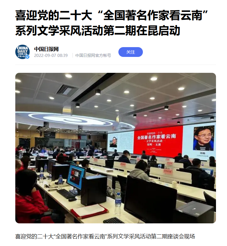 截至4月30日,“全国著名作家看云南”文学采风活动已引起全网关注超过5000万,其中网页关注超过3350万,微博话题超过683万。60个短视频在抖音号、微信视频号上也引起转发热潮。