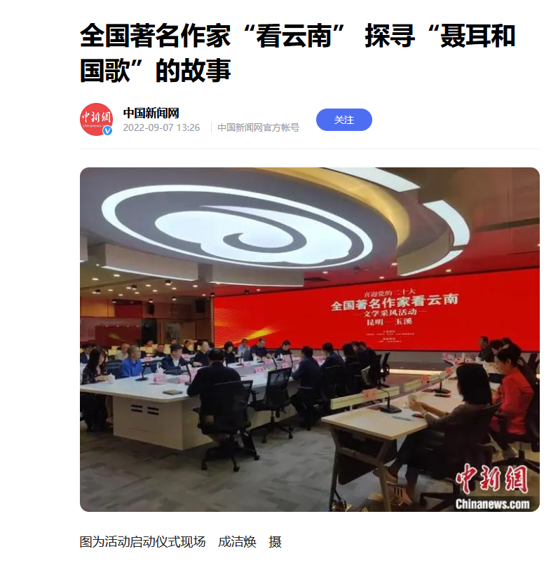 活动还引起了新华网、中国日报网、中国新闻网、新浪网、潇湘晨报等全国性和其他省级媒体平台的关注,中国文艺报、“学习强国”云南学习平台、云南发布、云岭先锋网,采风所到之处昆明、红河、玉溪、昭通等州市媒体和融媒体中心也协同发布相关信息,《小说选刊》、《中国作家》、中国诗歌学会官方微信公众号,今日头条、腾讯企鹅号、百度百家号、网易号、澎湃新闻、滇云艺海等网络平台和自媒体平台也积极参与宣传。