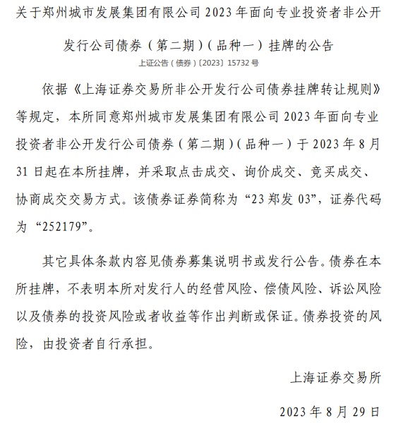 【大河财立方消息】8月30日,据上交所,郑州城市发展集团有限公司5亿元私募债已完成发行,将于8月31日起在上交所挂牌交易。